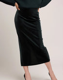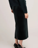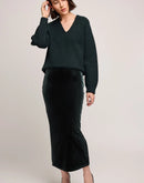The Dahlia skirt is made of a luxe velvet fabric. Features include an internal elastic waistband with a delicate scallop trim along the edge and a back slit.