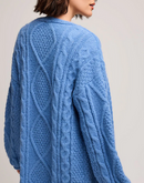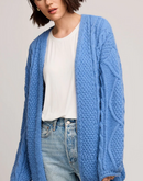 The Betty cardigan is made of a fuzzy yarn with a lofty feel. Features include various cable knit stitch patterns and a rolled sleeve hem detail.