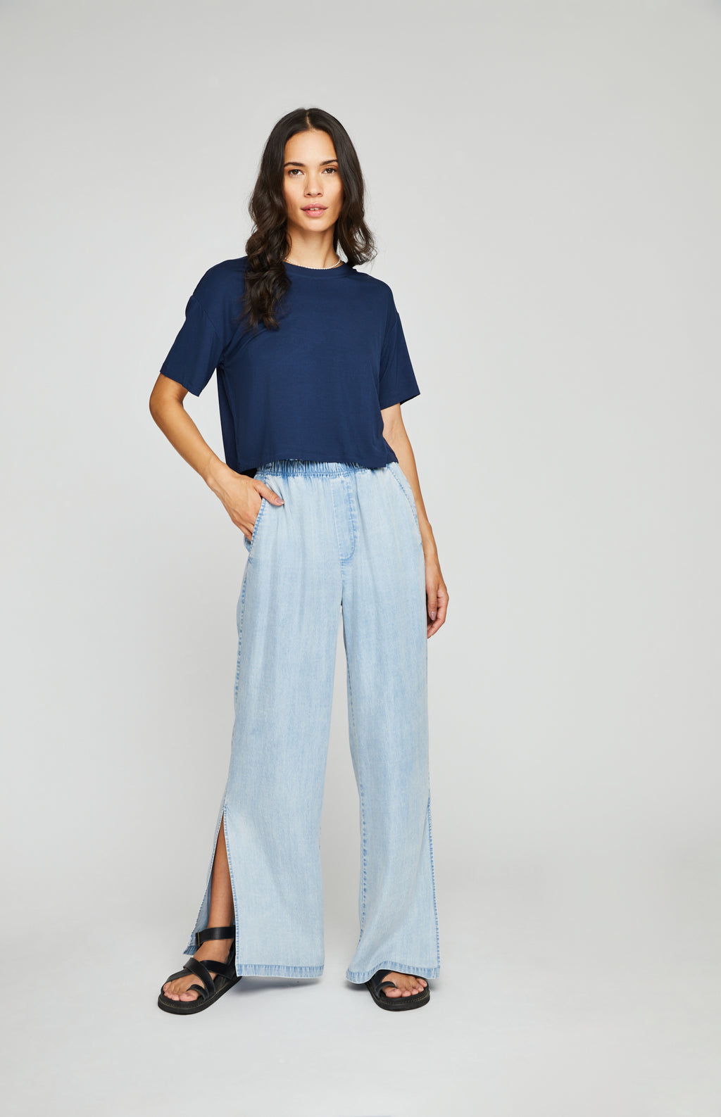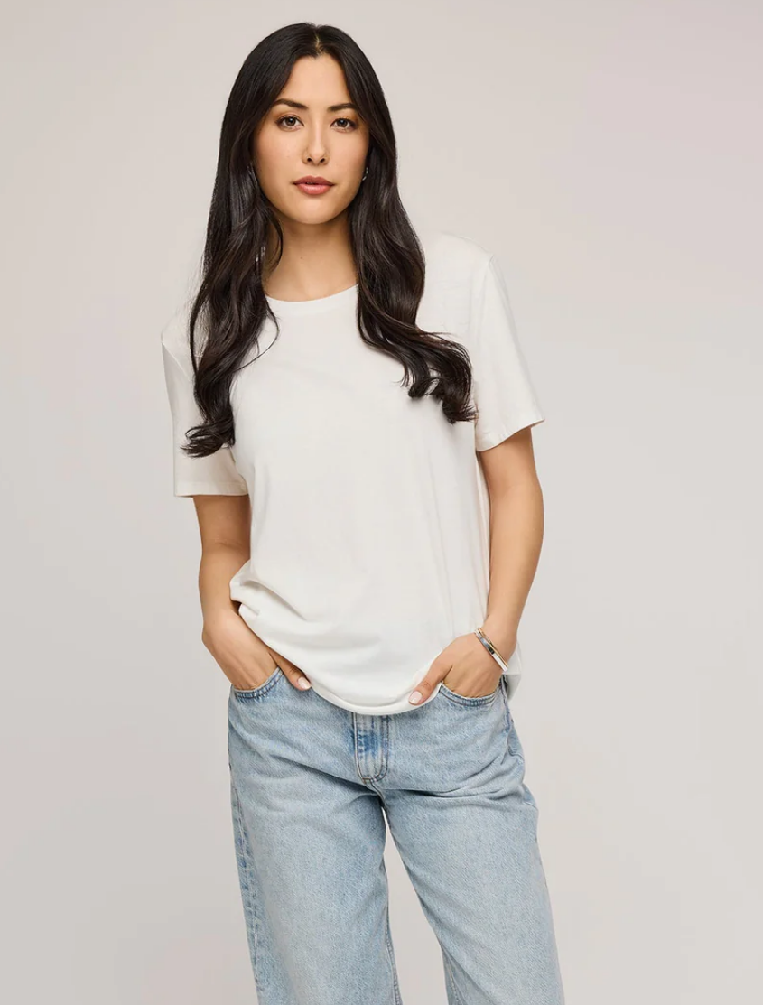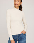 The Wren top is made of a stretchy ribbed fabric that hugs the body. The effortless silhouette can be worn as is or tucked into high-waisted bottoms.