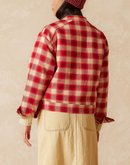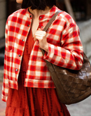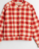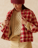 This quilted checkered jacket fastens at the front with snaps and has dropped shoulders. The cut is loose so you can wear a sweater underneath. It has integrated patch pockets and it's 100% organic cotton.