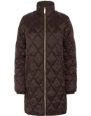 This long, lightly padded coat features a classic diamond quilted pattern and a high collar for extra protection against wind and cold. The sleek surface and gold-coloured zip add a modern touch. Ideal for transitional seasons and everyday wear.