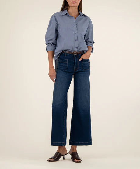 Upgrade your wardrobe with these chic high rise wide leg jeans in a versatile medium wash color. Featuring stylish patch pockets and a clean hem, they offer a flattering fit and modern silhouette. Perfect for any occasion.