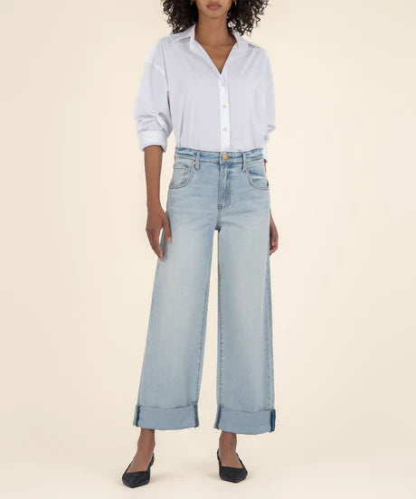 These high-rise jeans feature wide legs and roll-up hems for a fashion-forward, relaxed fit. With five pockets for added functionality, they’re perfect for casual or everyday wear.