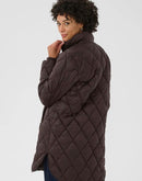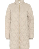 This long, lightly padded coat features a classic diamond quilted pattern and a high collar for extra protection against wind and cold. The sleek surface and gold-coloured zip add a modern touch. Ideal for transitional seasons and everyday wear.