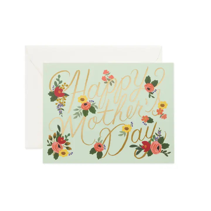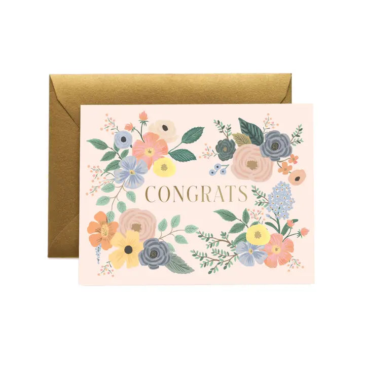 Rifle Paper Co presents the Garden Forest Congrats Card. A stunning piece, it features a gold envelope, giving it a touch of elegance and refinement. The card also boasts gold foil details that add a shimmering charm, making yo...