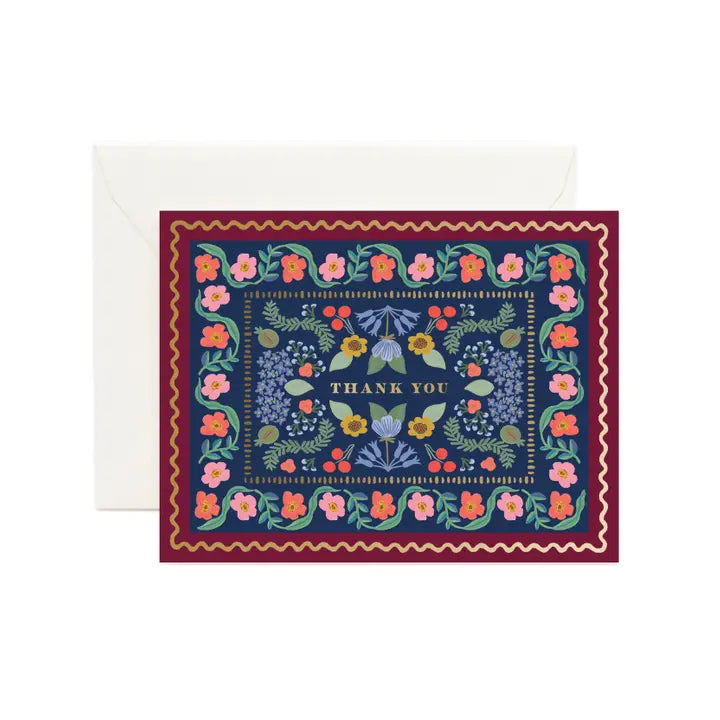 Introducing the Delphine Thank You Card from Rifle Paper Co., a lovely way to express your gratitude. This card features a soft white envelope and an interior left blank for your personal message. Accented with gold foil, it ad...