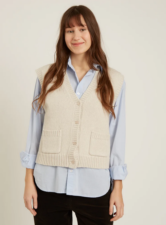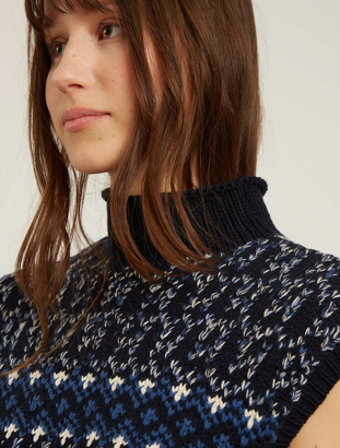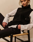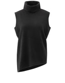 This sleeveless sweater is crafted from a soft cotton blend and features a turtleneck, straight fit, and asymmetric hemline. A diagonal seam across the front and back adds a modern touch to the design. Perfect to layer over a blouse or wear as a standout piece in your outfit.