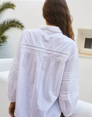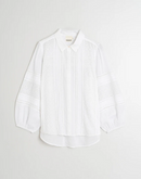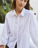 • Embroidered details with floral cut-out motifs, worked with pintucks and ladder lace inserts on a cotton voile.