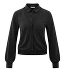 This stylish jersey blouse features a soft shirt collar, long balloon sleeves, and a button-down front. The design includes a double layer effect that creates the illusion of a layered cardigan over a blouse. Finished with ribbed cuffs and hem for a comfortable fit. A refined piece that adds depth and character to your look.
